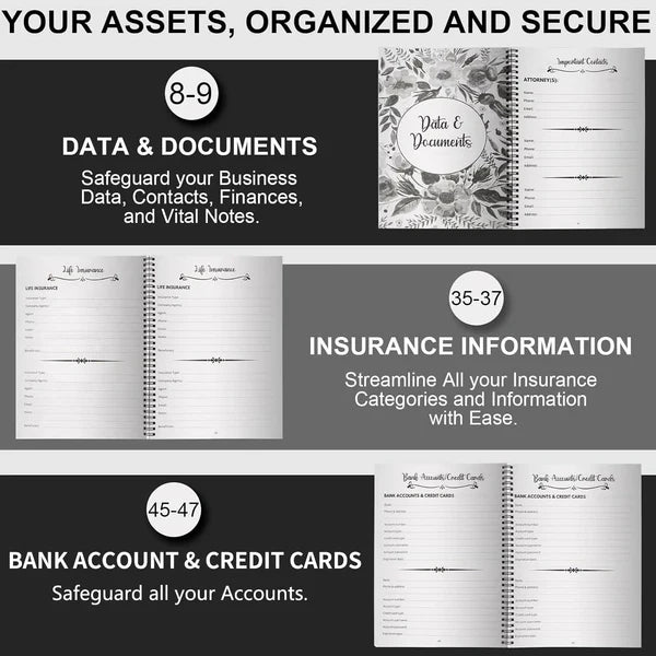 Keep all your important information in one place—dependents, beneficiaries, pets, insurance, accounts, passwords, and more. Each section is clearly organized to ensure nothing is overlooked when it comes to your final wishes.