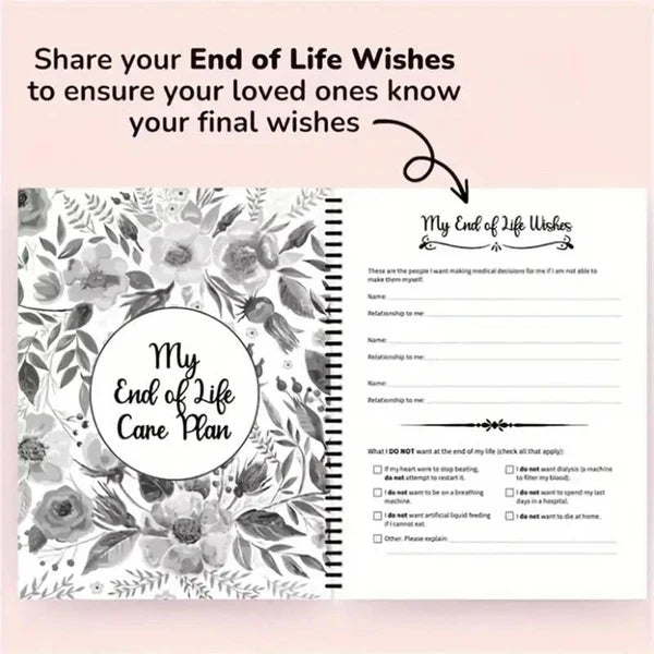 Store critical details about your attorney, doctors, family, and important accounts. Clearly outline medical decisions, organ donor preferences, and final wishes. Includes sections for letters, apologies, funeral plans, and your last words, ensuring your wishes are honored.